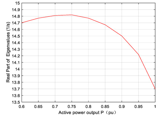 When Kppll takes these intermediate values, the correlation between the active power output and the mode damping will change from negative correlation to positive correlation with the decrease of Kppll. When Kppll takes the critical value, the real part of the dominant eigenvalues changes with the active power output as shown in Figure 7. Moreover, as depicted in Figure 7, the real part of the dominant eigenvalues gradually increases when the active power output increases from 0.6 pu to 0.75 pu, while the real part of the dominant eigenvalues decreases when the active power output increases from 0.75 pu to 1.0 pu. It can be found that when Kppll takes the critical value, the mode damping decreases first and then increases as the active power output increases.