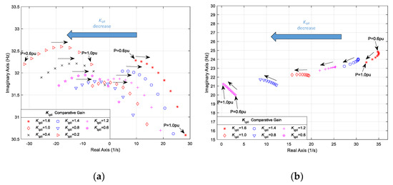 When the active power output is 0.6pu, the system has good stability through trial-and-error and adjustment of control parameters. The control parameters in this case are called the based-case as shown in Table 5. When the control parameters of the based-case in Table 5 are used (with the larger Kppll selected), the eigenvalue locus of the two SSO modes with the increase in active power output are plotted in Figure 10a. It is found that under the control parameters of the based-case, the eigenvalues λ6,7 move to the RHP with the increase of active power output. The mode damping decreases continuously, and the system stability is weakened. When the active power output reaches 0.75 pu, λ6,7 first crosses the imaginary axis and enters the RHP. The system becomes unstable. That is, there is a negative correlation between the active power output and the damping of the λ6,7 mode. The results proved that when Kppll is large, the active power output is negatively correlated with the damping of this SSO mode.