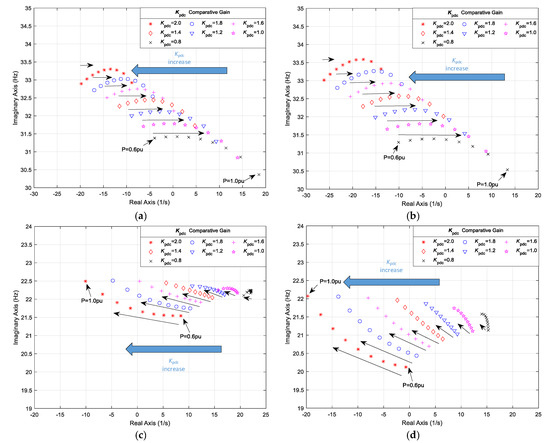 The Kppll of PLL is selected to be larger in Figure 9a,b. Figure 9a,b show that with different Kpdc, the dominant eigenvalues move towards the RHP as the active power output increases, and the mode damping decreases. The Kppll of PLL is selected to be smaller in Figure 9c,d and shows that with different Kpdc, the dominant eigenvalues move towards the LHP as the active power output increases, and the mode damping increases. Therefore, adjusting Kpdc does not change the correlation between the active power output and the mode damping. However, when the active power output is negatively correlated with the mode damping, the smaller the value of Kpdc, the greater the variation of the mode damping with the active power output. That is, system stability is more affected by the active power output (as shown in Figure 9a,b). Conversely, when the active power output is positively correlated with the mode damping, the greater the value of Kpdc, the greater the system stability affected by the active power output (as shown in Figure 9c,d).