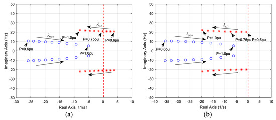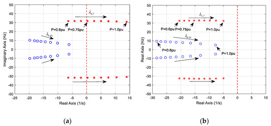 When the control parameters of group 2 in Table 5 are used (the smaller Kppll is selected), the eigenvalue locus with varied active power output is depicted in Figure 12a. It can be seen that the eigenvalues λ6,7 move to the LHP as the active power output increases. The damping of this SSO mode increases and the system stability is enhanced. Moreover, when the active power output of the wind farm is too small (less than 0.75 pu), the eigenvalue λ6,7 will be in the RHP. The system will result in diverging oscillation and become unstable. That is, the active power output is positively correlated to the damping of the λ6,7 mode. It is proved that when Kppll is small, the active power output is positively correlated with the damping of this SSO mode.