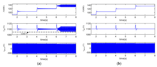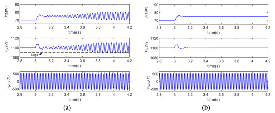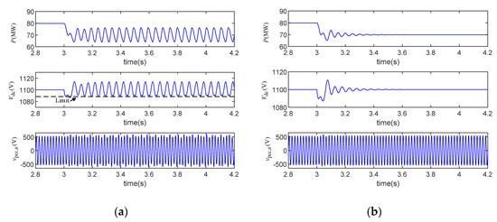 In order to verify the above analysis, an electromagnetic transient simulation model of the grid-connected wind farm system in Figure 1 is built in MATLAB/Simulink. The studied system adopts the control parameters of the based-case and the group 1 control parameters, respectively. At t = 3 s, the active power output of the wind farm increases from 0.7 pu to 0.75 pu. Responses of active power output, DC voltage and phase-a voltage of the PCC are observed and analysed. The corresponding time-domain simulation results are presented in Figure 11. It can be seen that when the active power output increases from 0.7 pu to 0.75 pu, the system with the control parameters of the based-case oscillates and becomes unstable. As shown in Figure 11a, the wind power has 31Hz oscillation. This further confirms the conclusion in Section 3 that the active power output is negatively correlated to the damping of this λ6,7 mode with a lager Kppll. Furthermore, the system with the group 1 control parameters is able to keep stable after disturbance, indicating that the damping of the SSO mode increased after adjusting Kipll and Kpdc. The simulation results are consistent with the analysis results above.