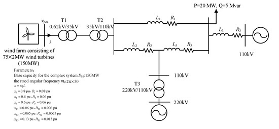 In this paper, a wind farm consisting of fifty 2 MW wind turbines connected to the AC grid through long-distance transmission lines is used as the target test system. The parameters of the system are listed in Table 1. The short circuit ratio (SCR) of this system is 1.53, which indicates that the wind farm is connected to a very weak AC grid [27]. The parameters of the wind generator are shown in Table 2.