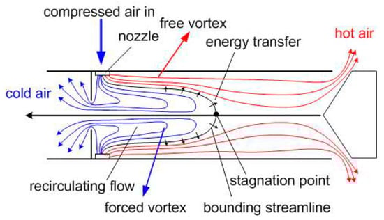 - Deissler, R.; Perlmutter, M. Analysis of the flow and energy separation in a turbulent vortex. Int. J. Heat Mass Transf. 1960, 1, 173–191. [Google Scholar] [CrossRef]