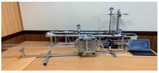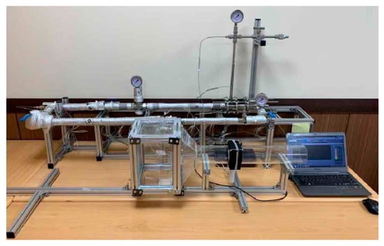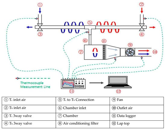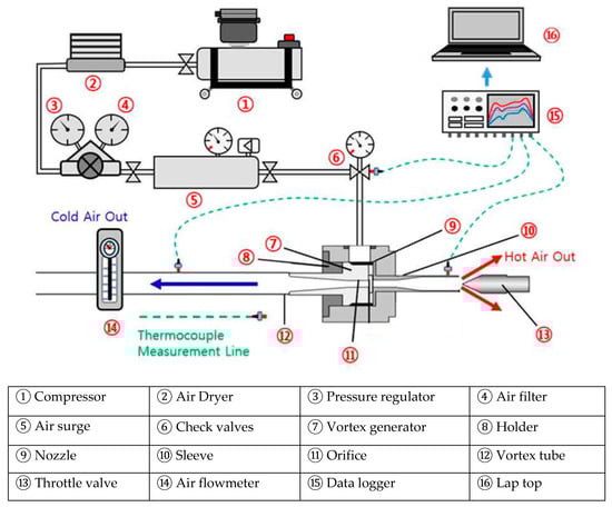 Figure 7 and Figure 8 show the schematic and actual experimental device for the indirect heat exchanger. Figure 9 and Figure 10 show a schematic of the direct heat exchange method and an actual experimental device. Configurations of the experimental device for the vortex tube can be largely divided into three types: a supply unit that supplies compressed air, a test unit that performs temperature separation experiments, and a control unit that controls the system. The supply section consists of an air compressor, air dryer, air surge tank, and pressure regulator, which supplies compressed air. The test section consists of a vortex tube and a throttle valve, thermocouple, pressure gauge, flow meter, etc., that can control the low-temperature air flow rate (yc). The control part is composed of a part that controls pressure and flow rate and a part that checks data from each temperature sensor. The air entering the inlets (shown in Figure 7 and Figure 9) is hot and cold air separated through the vortex tube; this air is supplied to each inlet. Table 2 shows the specifications of the device used in the experiment.