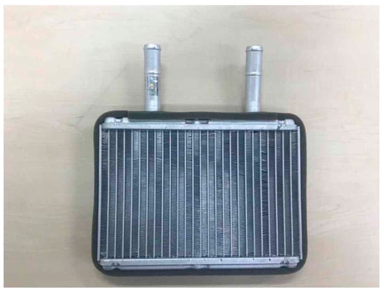 Compressed air that has undergone energy separation through the vortex tube first controls the temperature through a low-temperature and high-temperature valve, and this air is moved into the chamber through an indirect heater core where heat exchange is performed using a direct air conditioning filter. The temperature is measured. The heater core of the indirect heat exchanger used in the experiment is shown in Figure 5; the air conditioning filter of the direct heat exchanger is shown in Figure 6.
