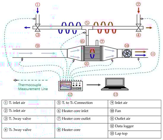 To conclude this study, the temperature difference between the indirect heat exchange method and the direct heat exchange method showed a maximum value of about 4 °C in the high-temperature region; the temperature difference in the low-temperature region was insignificant. Although the indirect heat exchange method looks slightly better when comparing the time to reach normal temperature, the indirect heat exchange method takes about four times longer than the direct heat exchange method, and the direct heat exchange method seems to have an excellent reaction speed. This is because the use of an indirect heat exchange type heater core induces flow velocity resistance, and the heat exchange of the heater core is performed only with air. However, when applied to an air conditioning system, the indirect heat exchange method, using external air or internal air, can implement a filter to reduce foreign substances; however, in the direct method, compressed air can be filtered only through the air conditioning filter. It is thought that it may be necessary to solve this problem. Therefore, for a vehicle air conditioning system, a direct heat exchange method with low reaction speed and low flow resistance can be used and, in the case of low-temperature airflow ratio (yc), a value of yc = 0.6, with high efficiency in both the low temperature and high-temperature regions, will subsequently be used in the air conditioning system of an eco-friendly vehicle. It is judged that this system can be applied and used effectively.