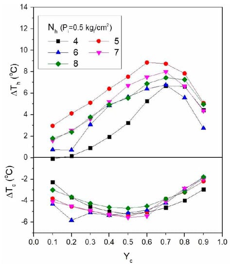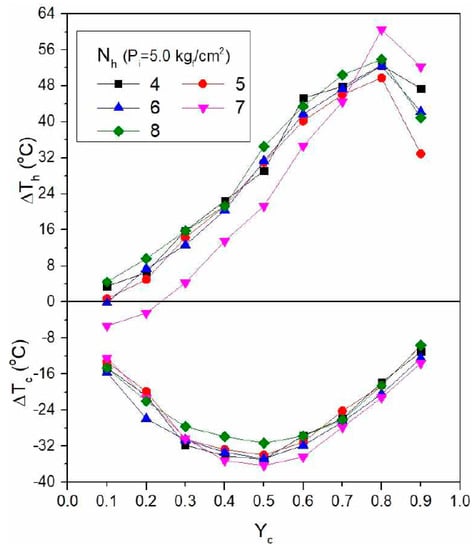 Temperature differences ∆Th and ∆Tc according to inlet pressure (Pi) 5.0 kgf/cm2.