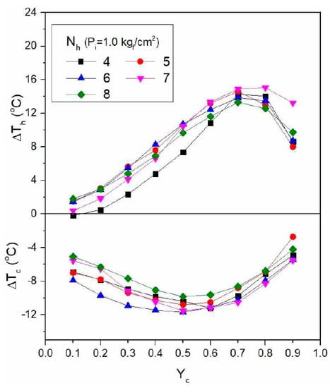 Temperature differences ∆Th and ∆Tc according to inlet pressure (Pi) 1.0 kgf/cm2.