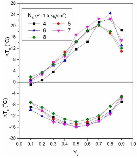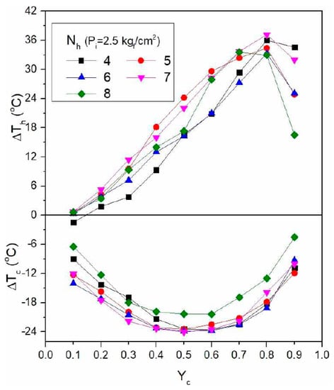 Temperature differences ∆Th and ∆Tc according to inlet pressure (Pi) 2.5 kgf/cm2.