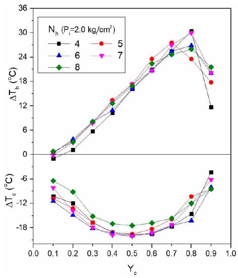 Temperature differences ∆Th and ∆Tc according to inlet pressure (Pi) 2.0 kgf/cm2.