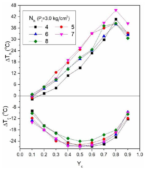 Temperature differences ∆Th and ∆Tc according to inlet pressure (Pi) 3.0 kgf/cm2.