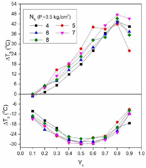 According to the experimental results, it was confirmed that ΔTh showed the highest high-temperature air from yc = 0.6 to 0.8 at high temperatures, and yc = 0.8 in the case of ΔTh, max as the pressure increased. In the case of low temperature, ΔTc showed the maximum low-temperature air from yc = 0.4 to 0.6, and in the case of ΔTc, max in the same case as the high temperature, yc = 0.5. As a result of these experiments, when the throttle valve on the high-temperature outlet is closed, yc increases and the flow cross-sectional area of the high-temperature outlet decreases. Therefore, the air at the high-temperature outlet flows back to the relatively low-temperature outlet, and the central flow becomes smooth. Additionally, when yc relatively decreases, the flow cross-sectional area of the high-temperature outlet becomes wider, and ΔTc tends to increase because the stagnation point in the vortex tube moves more toward the high-temperature outlet than it does when yc increases. It was judged that ΔTh and ΔTc increased because of active energy separation due to increases in momentum transfer between the central flow and the flow near the wall due to the change in yc. Through the experiments, it was found that ΔTh and ΔTc increased in a similar manner as the inlet pressure (Pi) flowing into the vortex tube increased. As the inlet pressure increased, the flow rate increased, and so the energy loss of the flow decreased, regardless of the number of nozzles, and the energy separation phenomenon became relatively large. This experiment trend showed similar tendencies of low-temperature outlet flow rate and entire pressure section, just as in Stephan [7]. Table 3 shows the ΔTh, max and ΔTc, max values of yc, and the number of nozzles depending on the pressure; in the case of Th, it can be seen that the number of nozzles varied from inlet pressure Pi = 0.5 to 2.0 kgf/cm2. However, after Pi = 2.0 kgf/cm2, it can be seen that the number of nozzles appears constant; in the case of Tc, the number of nozzles seems to change at Pi = 1.0 kgf/cm2. Overall, in the case of Th, the temperature was highest at yc = 0.8, and the nozzles were found to be efficient when they had seven holes. Tc was found to have its lowest temperature at yc = 0.5, and the number of nozzles was found to be efficient at seven.