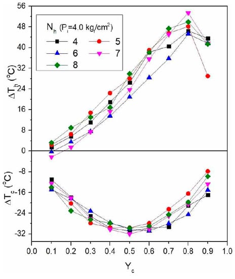 Temperature differences ∆Th and ∆Tc according to inlet pressure (Pi) 4.0 kgf/cm2.