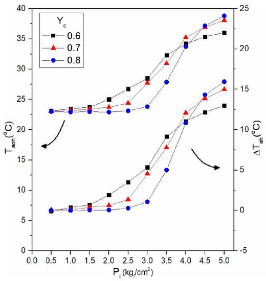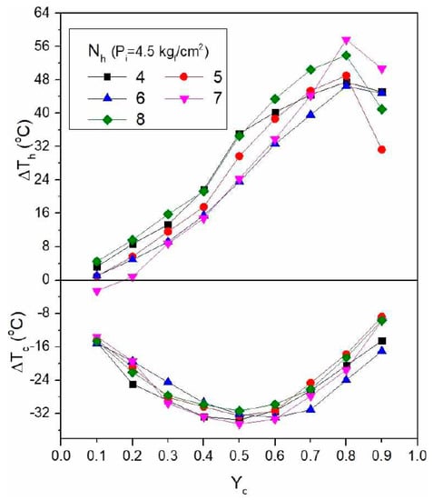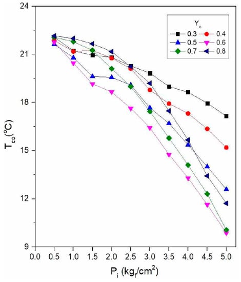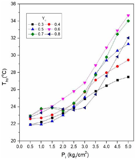 7. According to the temperature measurement results using the direct heat exchange method, when yc = 0.6 and between Pi = 0.5 kgf/cm2 and Pi = 5.0 kgf/cm2, Tco (°C) changed from 21.76 °C to 9.87 °C and its maximum difference was 11.89 °C. Additionally, Tho (°C) showed a maximum change of 11.63 °C from 22.97 °C to 34.66 °C.