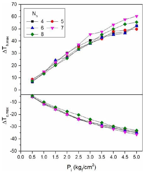 3.2. Discharge Flow Rate and Temperature Difference between ΔTh, max and ΔTc, max According to Pressure