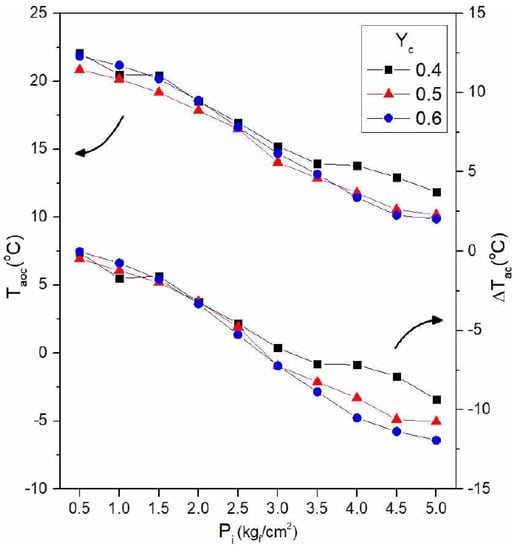 5. According to the results of temperature measurement in the indirect heat exchange method, Taoc (°C) changed from 21.84 °C to 9.87 °C when the pressure was between Pi = 0.5 kgf/cm2 and Pi = 5.0 kgf/cm2 in the low-temperature region at yc = 0.6 and in the high-temperature region at yc = 0.8. Taoh (°C) showed a maximum change of 15.79 °C, from 23.00 °C to 38.79 °C.