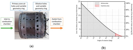 The proposed design of the combustion chamber with variable area air holes, in both primary and dilution zones, was devised, manufactured and evaluated on miniature combustion chamber test stand (test stand no. 1). Detailed results are presented in [27,30]. In Figure 3a, a model of the variable area combustion chamber air holes and respective area of dilution holes is shown. The system was applied to the MGT combustion chamber model and was installed on an experimental test stand allowing for the monitoring and recording of the thrust, emissions, pressures and temperatures. The test stand, measurement techniques and methodology are described in detail in [31,32].
