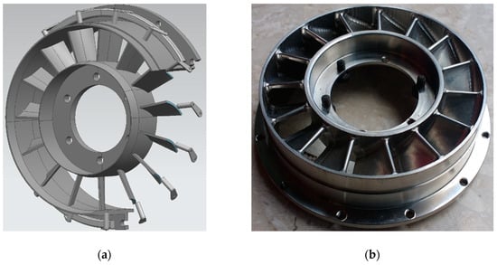 Researched adjustable turbine nozzle system: (a) 3D model of the variable geometry system; (b) manufactured nozzle with modified geometry (nozzle angle inclination increased +5°).