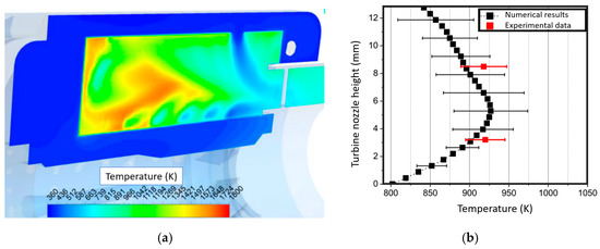 Turbine inlet temperature profile: (a) 3D numerical model visualization; (b) numerical and experimental data.
