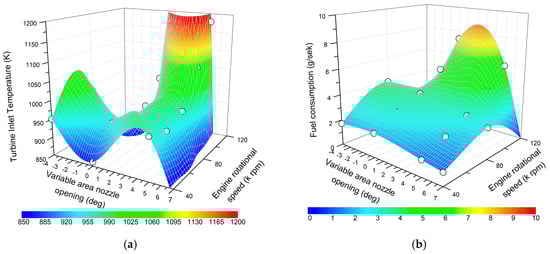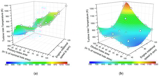 The results achieved using two different test stands are presented and discussed in this section. The air mass flow and fuel mass flow feeds were researched on test stand no. 2 in nominal configuration. Standard air and fuel mass flow rates at characteristic engine rotational speeds were established and used to feed the combustion chamber in test stand no. 1. Table 1 and Figure 6 show TIT measurements for nominal (100% opening) and variable combustion chamber air hole area achieved on test stand no. 1. The experimental measurement results on this and following 3D maps are marked with white bubbles. The achieved results are interpolated using the Renka–Cline algorithm [34] to cover the whole spectrum of MGT rotational speeds. The TIT varies depending on the combustion chamber air hole area. Experimental research on the variable primary hole area shows the highest TIT measurements for the nominal (100%) opening for all researched rotational speeds (Figure 6a). On the contrary, dilution hole area reduction allows for TIT increase at all rotational speeds. The highest TIT was achieved with 22% hole opening (Figure 6b). This result can be attributed to reduced cooling of the exhaust gases from the combustion chamber, which had the highest effect in the case of maximum researched rotational speed.