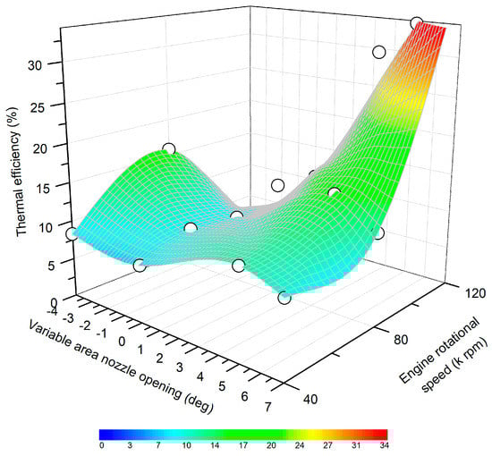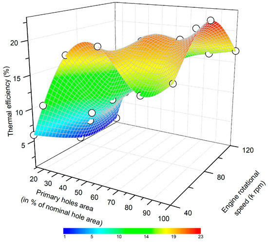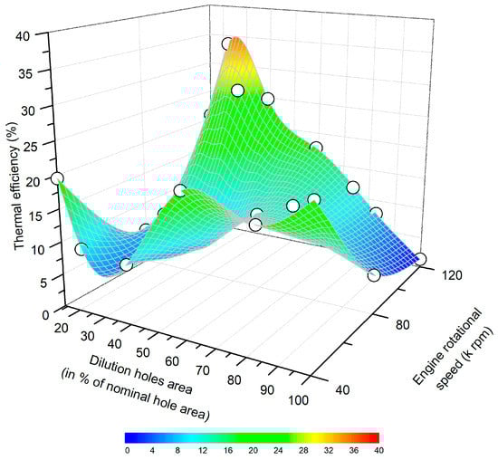 Results of the dilution hole variable geometry impact on simulated thermal efficiency is shown in Figure 9. The highest (up to 36%) thermal efficiency increase at high simulated rotational speed of 120,000 rpm was achieved with 22% dilution hole opening. The same dilution hole opening at lower rotational speeds of 40,000 and 80,000 rpm results in low thermal efficiency of 9% and 8%. This result is attributed to an increase in the combustion chamber temperature driven by dilution zone cooling decrease and the simultaneous increase in the primary combustion zone feed. The effect is especially strong when high air pressure is delivered at the highest rotational speed of 120,000 rpm. As discussed, this phenomenon reaches maximum at 22% dilution hole opening below which thermal efficiency decreases, when dilution hole area is further reduced to 14% of original opening. For other rotational speeds and dilution hole openings beyond 22%, only minor thermal efficiency improvement relative to 100% original hole opening can be observed at 80,000 rpm and 59% hole opening (by ca. 5% compared to original holes geometry). The applied Renka–Cline interpolation algorithm resulted in approximated pick close to the experimental measurement. The quantitative value of the visualized pick has not been experimentally confirmed.