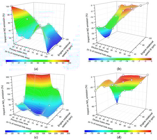 Combustion chamber variable geometry impact on nitrogen monoxide (NO) and nitrogen dioxide (NO2) generation: (a) NO and primary hole impact; (b) NO and dilution hole impact; (c) NO2 and primary hole impact; (d) NO2 and dilution hole impact.