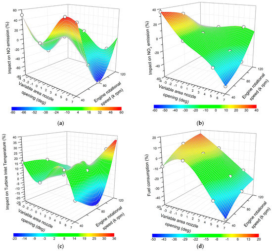 Turbine variable area nozzle impact on generation of: (a) nitrogen monoxide (NO); (b) nitrogen dioxide (NO2); (c) turbine inlet temperature; (d) fuel consumption.