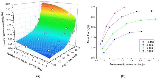 It should be noted that the turbine variable area nozzle allows not only to improve the thermal efficiency but also to regulate the thrust of an MGT [27]. For example, reducing thrust is not desirable when operating with a heavy load, but can be very beneficial when operating at a partial load, which was also mentioned in [24]. The variable nozzle area effect on engine thrust, SFC and mass flow rate has been shown in Figure 14. The SFC decreases for a wide range of engine operating points, characterized by thrust, with turbine nozzle closure (Figure 14a). The highest decrease was observed at low thrust. Turbine nozzle closure also affects turbine operating line reducing mass flowrate and choking the flow at lower mass flow values (Figure 14b).