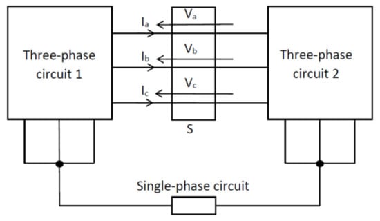Figure 2. A single-phase circuit connected across the star centers is also included. In the simplest case, such a single-phase circuit consists in an impedance (open and short circuits as special cases). The three-phase port (i.e., three-port component) S is the circuit representation of the three-phase section where line switching is located. As a three-port component, S will be defined by three relationships describing line switching (one or two lines involved). The methodology outlined above foresees first the removal of S in order to obtain the three-phase system with phase symmetry represented in
