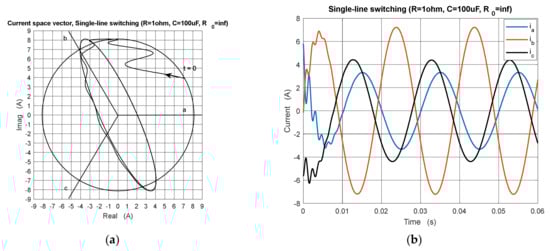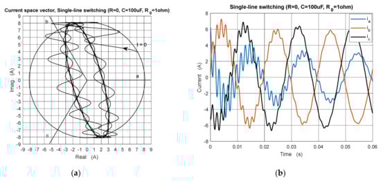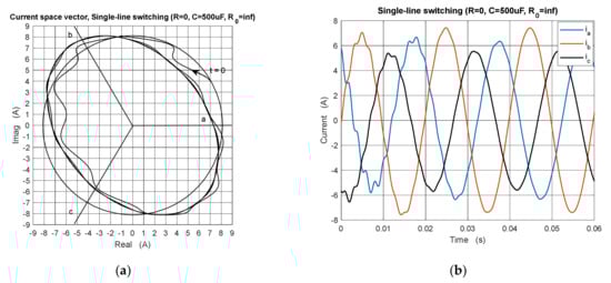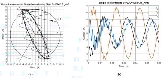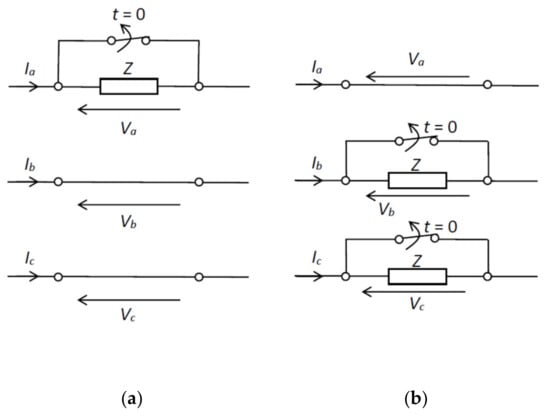 Figure 11a,b shows the case of an open single-phase circuit, and single-line switching with