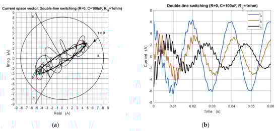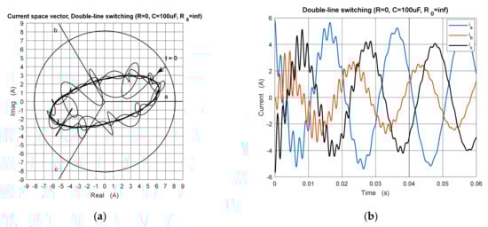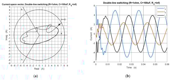 Figure 11a,b shows the damping effect of the resistor. In fact, oscillations are rapidly attenuated both in the space vector and in the phase currents. Notice that the ellipse in
