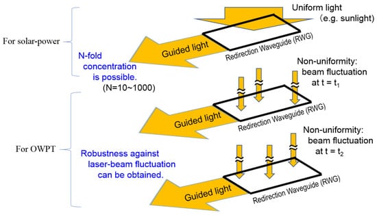 Solar power density on Earth is a little bit too low, and when it is concentrated, the efficiency of solar cells can be improved due the increase in operation voltage. Actually, concentrator solar-cell systems as well as solar thermoelectric power generation have been of importance. In those systems, sunlight is concentrated using mirrors [12,13] and/or parabola antennas [14]. In this sense, those systems can be regarded as the primary light-harvesting part is decoupled from the place where photoelectric or thermoelectric conversion is conducted. In other words, the aforementioned spatial degeneracy of light-harvesting and photoelectric conversion is lifted, although those concentrator systems are very huge in volume, because the light passes three-dimensionally from the place of light-harvesting to photoelectric conversion part. Thus, such bulky systems [13], being relatively easy to be installed in desert and dry land, are very hard to introduce in metropolitan areas. Now, it could be revolutionary if we could connect those two parts, i.e., the place of light-harvesting with that of photo-electroconversion, not three-, but two-dimensionally. Once this is done, the situations depicted in Figure 1 become possible, i.e., on one hand, this new scheme serves as a harvester of photons or “summation machine” of photons of any spatial distribution. The new scheme functions as a concentrator solar cell system when the incoming light is spatially uniform like in the case of sunlight. On the other hand, when the incoming light is of the form of Dirac’s δ-function, the scheme just simply sums up those δ-functions with the zero photon field around them. No matter how many times zero is summed up, it gives zero, i.e., the summation results only care about the number of δ-functions, not their positons. In OWPT, a laser beam is, in good approximation, δ-function-like. Thus, as depicted in the lower two drawings in Figure 1, the new scheme gives same/identical output no matter where the laser beam arrives at in the detector (RWG), resulting in a robust OWPT system. In an approach to achieve potentially lower cost in solar photovoltaic generation, developed are luminescent solar concentrators (LSCs) [15,16,17] that, are meant to be used in a similar manner as depicted in Figure 1 for low optical intensity like sunlight, not for laser beams, simply because they penetrate LSCs.