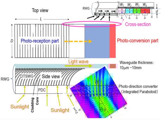 Thus, we propose a new system in which photoharvesting/photoreception part is spatially decoupled from, but two-dimensionally connected to, photoelectric conversion (photo-conversion) part by thin (2D) waveguide (WG) [18] as depicted in Figure 2. We call this system 2-Dimensionally connected photoreception-photoelectroconversion (or, in short, 2D-PhotoRecepto-Conversion) (2DPRC) scheme. Note that the 2DPRC scheme, realized by redirection waveguide (RWG) consisting of photo-propagation direction converter (PDC) and discrete translational symmetry waveguide (DTSWG), and a planar (2D) waveguide as shown in following chapters, gives a natural concentrator system in which concentration factor is given by the photoharvesting area, L × D, divided by the edge light-injection area, D × d, i.e., L/d, with L, D, and d being the harvesting length, width, and the semiconductor thickness, respectively. By taking, for example, p-i-n structure, d can be set much longer than just 100 nm. Depending on the photocarriers’ lifetime, or crystal quality, d could be as thick as tens of to hundreds of microns letting L be tens to hundreds of millimeters when “x1000” concentration is made for orthogonal photon-photocarrier propagation configuration discussed in Section 2.2.1. Note that the 2DPRC scheme can be applied to conventional millimeters-wide tandem solar cells by utilizing, in RWG, a thicker 2D waveguide that is merged into by DTSWG, in which case L could be in the orders of 1 m to 10 m. Realizing the aforementioned WG is, however, quite challenging because a good WG is supposed to convey light-waves/photons for a long distance from one end to the other without losing them in between, which means it is very hard to harvest photons into the core of the waveguide between the two ends when we think of the time-reversal symmetry of Maxwell’s wave-equation.