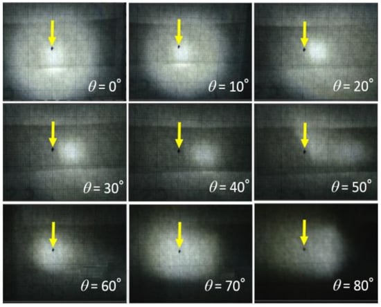 The position of LED light seen from the back of the screen being ~15 mm apart from the paraboloids sheet of PDC, behind which the LED is set with various incident angle θ with respect to the PDC. The arrows show the center of the incident LED light beam.