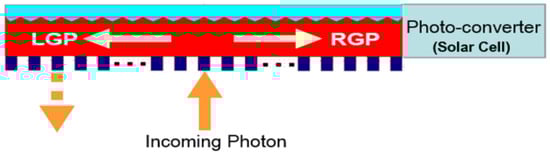 The second function of the RWG is to make the vertically coming 3D light change into 2D-photons in the thin slab waveguide in the RWG as shown in the middle of Figure 2. Since the equation that governs the electromagnetic field (Maxwell’s wave-equation) has time-reversal symmetry, photons being never lost to outside in the middle of a waveguide means that they, when time-reversed, never come into the WG from outside, either, except for at the WG’s two ends. Actually, our first model system was a diffraction-based redirection waveguide exploiting refractive index modulation which has a symmetric structure and has the fundamental difficulty [22]. Let’s consider the case where the incoming 3D photons are to go into 2D WG and finally hit the photovoltaic device placed at the right end as shown in Figure 5. In general, for any symmetric WG, there are as many left-going photons (LGPs) as right-going photons (RGPs) for incoming 3D photons to go into the 2D waveguide as seen in Figure 5. Now, the fundamental problem is that LGPs can be regarded as time-reversed RGPs and that the symmetric WG, which turns the incoming 3D photons into RGPs, at the same time, lets LGPs go back into 3D space again as denoted by dashed arrow in Figure 5. Thus for the symmetric waveguide, the 3D to 2D convertibility could not be very high because of the synergy of spatial and time-reversal symmetries. Note that luminescent solar concentrators (LSC) [15,16,17] would not be free from this fundamental limitation either, because the dyes and/or quantum dots are uniformly distributed in the LSCs, which, thus, are in a category of symmetric waveguides.