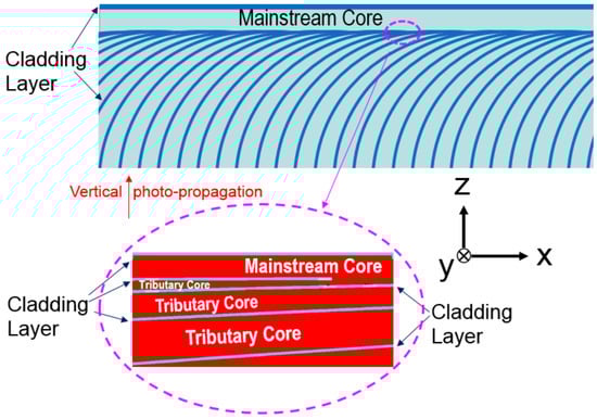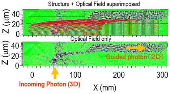 Thus, as shown in Figure 6, we are led to a system in which photoharvesting/photoreception part (bottom left of top figure) is spatially decoupled from, but 2D-connected to the photo-conversion part by an asymmetric waveguide. Note that in this new structure, the bottom cladding layer for the 2D waveguide (the main stream), being not spatially continuous as shown in the bottom of Figure 6, gives the 2D waveguide’s core an open geometry. Thus, the core is connected, through the curved tributary waveguides, to the bottom plane where photons come in vertically thanks to the PDC [23], for which an example of corresponding simulation result is shown in the right bottom inset of Figure 2. Thus, proposed is a discrete translational symmetry waveguide (DTSWG) [21], which is in marked contrast to the conventional waveguides and optical fibers that have continuous translational symmetry. Due to the discrete cladding structure, the waveguide can harvest 3D photons coming vertically from beneath in Figure 6, or equivalently, in bottom left of Figure 2. As discussed later in this paper, at the right end of the WG are placed multi-stripe orthogonal photon-photocarrier propagation solar cells (MOP3SC) in which photons propagate in the direction orthogonal to that of the photocarriers [21] as depicted in the top right inset of Figure 2. Simulation of light propagation in the new WG depicted in Figure 2 and Figure 6 is performed with finite difference time domain (FDTD) method [24] and the result is shown in Figure 7, where the refractive index of the core of the mainstream and also tributary curved waveguides is set to be 2.0 and that of the cladding layers 1.35. In this simulation, the period of tributary WG is 2.66 μm with widths of the core and cladding layer being 2.46 μm and 0.4 μm, respectively, and photons with a wavelength of 740 nm come from the bottom end of the curved tributary waveguides as shown in Figure 7. Although we have to be careful about the wavelength—dependence of the refractive index, RWG is of catoptric system, i.e., photons propagate with total reflection through the waveguide, and we would basically be free from severe wavelength-dependence of the 3D-to-2D conversion efficiency of the sunlight, since the aforementioned period of tributary WG is 2.66 μm being much longer than the wavelengths of the most of the major energy-carrying photons in the sunlight. For the 2D WG (main stream), we have set its bottom cladding to be discrete and to touch the mainstream core tangentially as shown in Figure 6. As a result, the light propagation is not much affected by the openness of the core nor by the discreteness of the bottom cladding layer as seen in Figure 7.