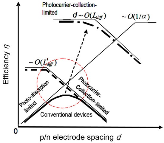 Expected d-dependence of efficiency in the orthogonal photon-photocarrier propagation solar cells. α is the absorption constant, and Ldiff (L’diff) is the diffusion coefficient of photocarriers in the high (low) mobility material.
