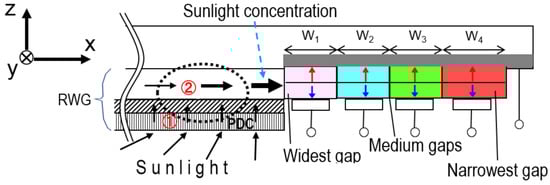 The RWG is, of course, applicable for both concentrator solar cells and OWPT, and that is the case even when RWG is coupled with the MOP3SC structure shown in Figure 9. For the case of concentrator solar cells, it is obvious because MOP3SC can convert blackbody radiation of the Sun into electricity quite effectively. The merit of using MOP3SC, on the other hand, for OWPT is that we can multitask with a single system, i.e., we can harvest power through the first stripe (having a well-tuned bandgap for the laser beam, with width W1), and also so receive triply superimposed control-signals with longer wavelengths with the three stripes (with widths W2 ~ W4) simultaneously just with the single RWG-coupled MOP3SC shown in Figure 9.