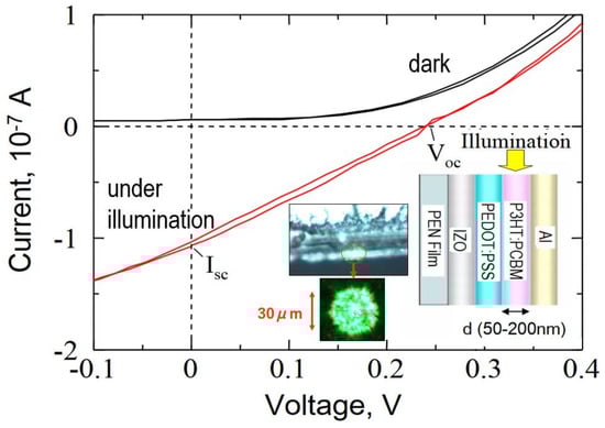 For proof-of-the-concept experiment, we have made a structure shown in the inset of Figure 10. Two-hundred-micron thick PEN with 200 nm thick IZO electrode is used as a substrate, on top of which 50 nm thick PEDOT (Poly(3,4-ethylenedioxythiophene)):PSS (poly(styrenesulfonate)) film and P3HT (poly (3-hexylthiophene)):PCBM ((6,6)-phenyl-C61-buteric acid methyl ester) layer with thickness d = 50–130 nm are spin-coated. Then Al electrode is prepared finally by vacuum evaporation. The sample is illuminated using a green laser having wavelength λ = 532 nm and power of ~1 mW. The light is shed from two different directions: one is a conventional illumination configuration in which photons impinge on the structure perpendicularly with respect to the layers and the other is, as the thick arrow shows, the edge illumination configuration for which a modified system of microscopic photoluminescence (PL) is used with its focus on the edge surface. The laser spot size, there, is roughly 30 μm in diameter with tailing skirt-part included, but its strongest spot size is much sharper, a couple of microns in width. Because of this inherent spot size and the Gaussian beam waist located at the edge with focal depth of about 1 μm, we can observe that well-focused excitation photons are made and go along the layer of P3HT:PCBM in the sample starting from the edge [32]. Although the current is not so large as noticed by minute hysteresis in Figure 10, we do observe the photovoltaic characteristics under the edge illumination as shown in Figure 10. Both in the dark and under the edge illumination, we have measured the I-V curve of the cell and obtained open circuit voltages Voc’s and short circuit current Isc’s. For comparison, we also have measured I-V characteristics using the same solar cell sample under the conventional vertical illumination configuration.