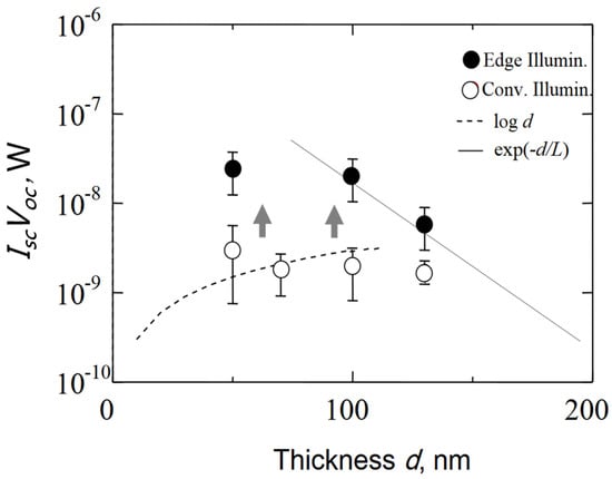 Based on those measurements, we plot the product Isc·Voc (∝ η: conversion efficiency) as function of the active-layer thickness d in Figure 11. Blank circles are for the data obtained under conventional illumination and solid circles under the edge illumination. We can see in Figure 11 that Isc·Voc start to decrease for d > 100 nm and is good agreement with the d-dependence of the conversion efficiency observed using the same active-layer materials [33]. In Figure 11, dashed is a line of log d, and the solid line is corresponding to the dependence of exp(−d/L) with L = 30 nm, which is in good accord with what was obtained before when considering the active-layer preparation. Reported was a strong dependence of efficiency from bimolecular recombination, arising from the photoconversion of light at high intensity [34], but this effect equally affect the data points for edge-illumination in Figure 11 because the beam size is larger than d’s for those devices. We can virtually neglect this effect when we discuss the relative d-dependence of the conversion efficiencies in the edge-illumination configuration. The blank circles are, to a fairly good approximation, on the dashed line for d ≤ 100 nm, and the solid circles are well on the solid line for d ≥ 100 nm, which is understood, using Figure 8 (especially for the region encircled by red dashed line where the photo-absorption-limited and photocarrier-collection-limited lines are crossed) that the trade-off (denoted by the thick solid line) seen in the conventional illumination regime is lifted off in the edge illumination configuration, or in the orthogonal photon-photocarrier-propagation mode, as depicted by the thick dashed line in Figure 8. In this mode, the conversion efficiency η, remain high for a small d region for which the conventional illumination (or parallel photon-photocarrier-propagation mode) gives low η because of the loss of photons due to their penetration through the thin active-layers. This result manifests the superiority of the orthogonal photon-photocarrier propagation solar cell anticipated in Figure 8. In the multi-striped orthogonal photon-photocarrier propagation solar cell (MOP3SC), we can concentrate on utilizing high mobility materials getting free from the constraint on α by making the stripe width several times 1/α, and would fully enjoy high conversion efficiency depicted by dash-dot line in Figure 8. The MOP3SC, being coupled to the RWG is of much importance for the next generation of solar cells with a possible high efficiency.
