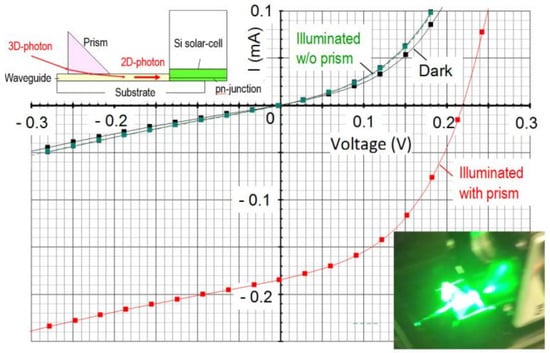 Figure 12 shows the edge-injection experiment in which photons run parallel to pn-junction of Si solar cell. In this experiment a prism and thin film waveguide are used. We have observed photovoltaics in this configuration. Note that the I-V characteristics with laser on but prism off is almost the same as that without laser beam, which indicates how important it is to have a good coupling of the 2D-waveguide with MOP3SC.