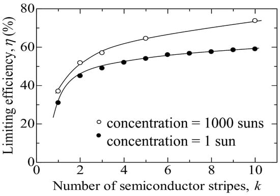 where nph(Eg) is the solar flux absorbed by a semiconductor with energy-gap Eg. Figure 13 shows limiting energy conversion efficiency as a function of the number of semiconductor stripes for solar concentration of 1 sun and 1000 suns under AM1.5 condition [37,38]. We expect that the new solar cell could convert virtually the whole spectrum of solar light into electricity by choosing semiconductors with appropriate energy gap.