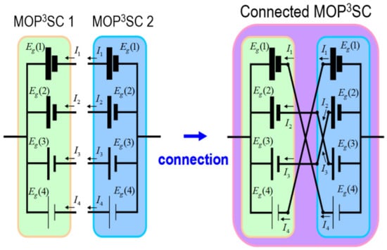 where ΔE = (Eg max − Eg min)/k with Eg max = Eg(1) and Eg min = Eg(k) by definition. Component unit cells in MOP3SC 1 and MOP3SC 2 are connected in such a way that the j-th component cell in MOP3SC 1 with the (k − j + 1)-th in MOP3SC 2 as shown to the right of Figure 14 (for the case of k = 4). Now, the output voltage Vj from the serially connected components is