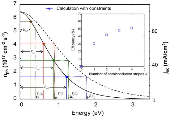 Limiting conversion efficiency of connected MOP3SC is as follows. In Figure 15 the area under the nph(Eg) curve (dashed line) is just equal to the total solar power per unit area. As shown in Figure 15, Emj corresponds to the energy per photon delivered to the load at the maximum power point [21] with respect to the j-th stripe. Here, because of the connection scheme shown in Figure 14 (for k = 4), we have to calculate limiting energy conversion efficiency by maximizing the area of rectangles in Figure 15, based upon Equation (2), treating Eg(j) as variable parameters with the constraint with respect to current,