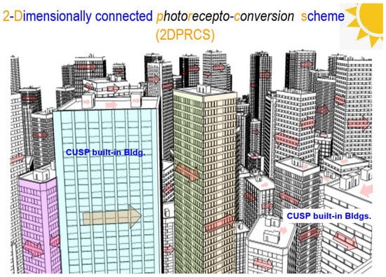 DWG-coupled MOP3SC has diffusive light convertibility and will serve as an ultimate all-in-one system in near future. For that to happen we have to manage to fabricate the RWG structure consisting of PDC shown in Figure 4 and DTSWG in Figure 7. Ideally, we can obtain limiting energy conversion efficiency more than 50% using four stripes of semiconductors for MOP3SC and RWG. The latter can be spatially degenerated with building outer walls and windows. Integrating all of the new ideas liberated by the concept of lifting off the old-fashioned spatial degeneracy of photoharvesting (photoreception) and photo-electroconversion, we would be able to have a mega-solar power plant, even in metropolitan areas as schematically depicted in Figure 16, based on the 2DPRC scheme, which can be used not only for solar power generation but also for OWPT or laser power beaming, which can play a crucial role as a life line, especially for hospitals and/or nuclear power plants when electrical power lines are disrupted by earthquakes, floods, tsunamis, or other emergencies.