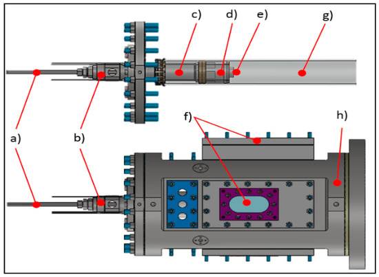 Experimental rig (a) instrumentation and pilot injection lance, (b) inlet plenum, (c) mixing plenum, (d) radial-tangential swirler insert, (e) exit nozzle, (f) quartz window, (g) quartz confinement, and (h) high-pressure optical combustor (HPOC) casing.