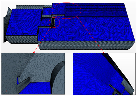 Mesh used for modelling. (Top) Full mesh; (Bottom left) Details of the swirl vanes; (Bottom right) Close-up of local mesh refinement.