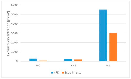 Initial results were conducted to validate the CFD model against previous experimental data [34,39,50]. The results in Figure 3 and Figure 4 show good correlations. In terms of emissions, ammonia emissions are in good agreement with previous experimental campaigns (250 ppm versus 200 ppm). However, hydrogen is greater than predicted by the CFD study (3000 ppm experimentally against 5500 numerically). Simultaneously, NO emissions are over-predicted almost fourfold (293 ppm numerical and 70 ppm experimental). Although the ammonia has been well predicted, the consumption of hydrogen and its reaction close to the flame need to be further assessed by reaction mechanism developers.