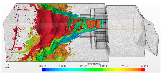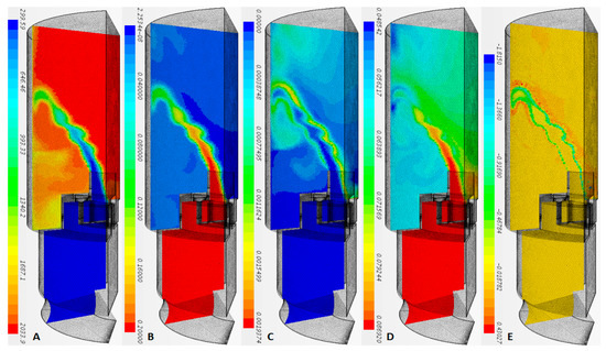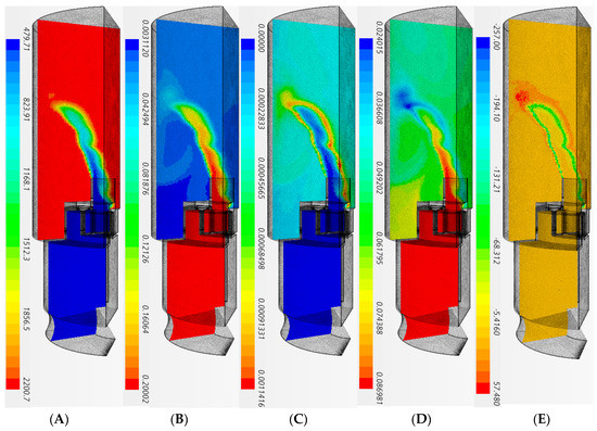 However, the highly concentrated hydrogen post-flame barely reacted (Figure 5D), a consequence of the lack of oxygen and under-predictions in the reaction rates under these conditions. Traces of other radicals such as OH and water would increase the reactivity of hydrogen in the region, point observed by others [39]. This problem, previously observed in other works, is currently under research and is left aside for further analyses. However, the results are in the same order of magnitude to those obtained experimentally, thus enabling the analysis to move forward to semi-industrial conditions.