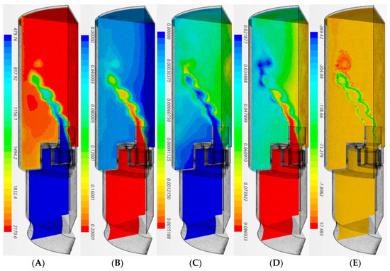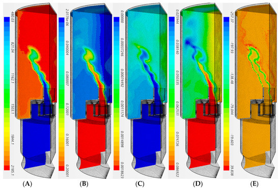 (A) Temperature (K); (B) ammonia concentration (mol%); (C) NO concentration (mol%); (D) hydrogen concentration (mol%); (E) hydrogen rate of production (kg/m3·s). Operating conditions: 900 kPa, 500 K inlet temperature, 1800 K quartz tube.